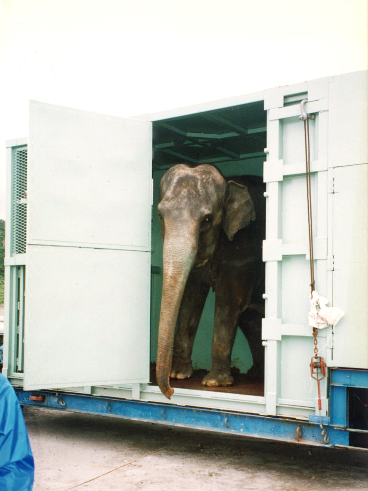 そして、長い間一人で過ごしていたランディは、久しぶりに会うぞう達と少しずつ絆を深めました。ライティを失ってから塞ぎこんでいたミッキーを、福岡県で開催予定のイベントへ連れていけるだろうか? 移動日当日、私の不安は的中しました。車に乗ってくれないミッキーの代わりにランディが車に乗り、そしてフェリーで移動をしたランディ。まだ携帯電話のない時代で、船会社からの電話でぞうが輸送中に扉の留め金を鼻で外してしまったと連絡を受け、とても驚かされました。何とか無事に『アジア太平洋博覧会』のパレードに参加することができました。帰りもフェリーと思いましたが、安全な陸路でいっしょに帰ることになりました。